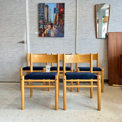 An Exceptional set of Danish Mid-Century Modern birch dining chairs. These dining chairs are made entirely from light yet strong birch wood. Manufactured in Denmark in the 1970's, these chairs have an iconic and beautiful design. The solid birch frames are a lovely light shade and will be perfect in any Scandinavian style design. design. The open, mid-rise frame has a thick round, sculpted solid birch legs and cross bracing for added stability. The uniqueness of these chairs is the perfectly angled, mid-rise, solid birch back rest which has been steam bent in 3 dimensions. The proportions make these chairs make them incredibly comfortable for various body types. Professionally reupholstered in a blue fabric by Maharam. The strong yet open design of the chair creates visual interest yet does not take up too much visual space. Open simple design, characteristic of great Danish Modern furniture. Stamped.