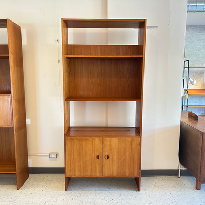 Crafted in Denmark and stamped by the manufacturer, this Mid-Century Freestanding Teak Wall Unit by Rud Thygesen & Johnny Sorensen for HG Furniture is a versatile, stunning addition to any space. This modular teak unit features adjustable shelves and a lower bar cabinet to fit your needs. The bar cabinet can be accessed from the top and through the doors. There is storage for 7 bottles and glass for glasses. There is also a movable L shaped shelf. Designed for easy assembly, this unit can be fully dismantled for convenient moving or storage.